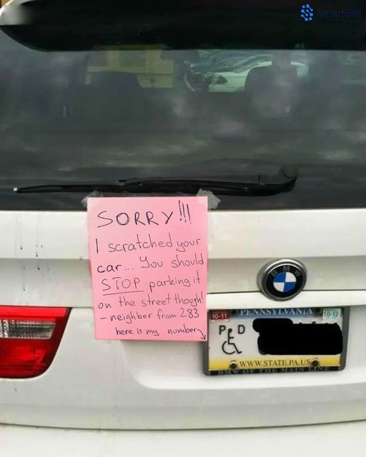 The note read: “Sorry, I scratched your car last night. You shouldn’t park on the street though! -Neighbor from 283. This is my number in case you need anything!”